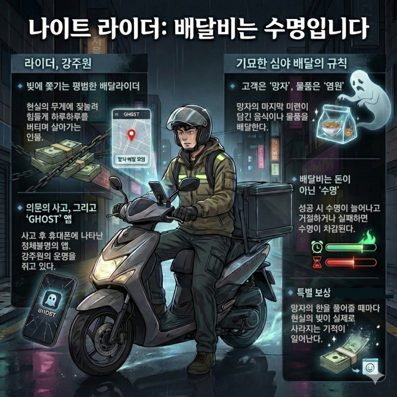 빚더미에 앉아 벼랑 끝으로 내몰린 배달 라이더 강주원은 빗길 사고 이후 의문의 앱 ‘GHOST’를 마주한다. 이 기괴한 앱은 망자들의 간절한 염원이 담긴 음식을 배달하라는 주문을 내리고, 그 대가로 돈 대신 ‘추가 수명’과 현실의 ‘불행 소거’라는 파격적인 보상을 약속한다. 주원은 오직 생존을 위해 산 자와 죽은 자의 경계를 넘나드는 위험천만한 심야 질주를 시작한다.